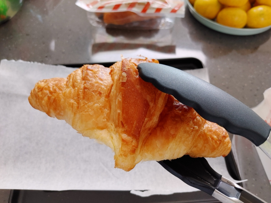 80%만 구워져서 아직 촉촉한 상태, 세게 누르면 찌그러질 수 있으니 집게로 조심스럽게 집어서 오븐, 에어프라이어에 구워 주세요. 촉촉한 크루아상을 좋아한다면 바로 먹어도 무방합니다.