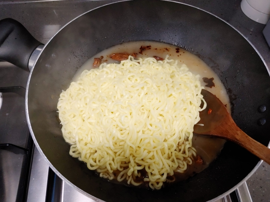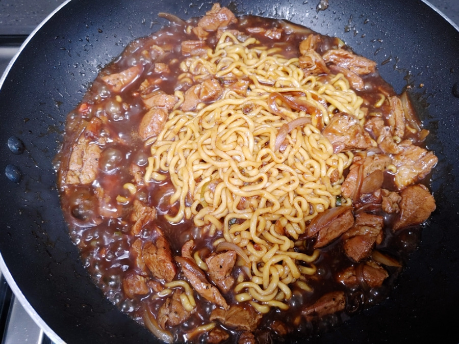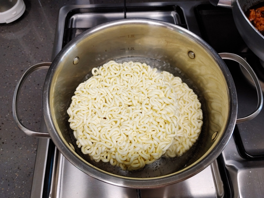 잘 끓고 있죠? 면이 반쯤 익었을 때 불 끄고 면수까지 모두 짜장 소스에 부어주세요.