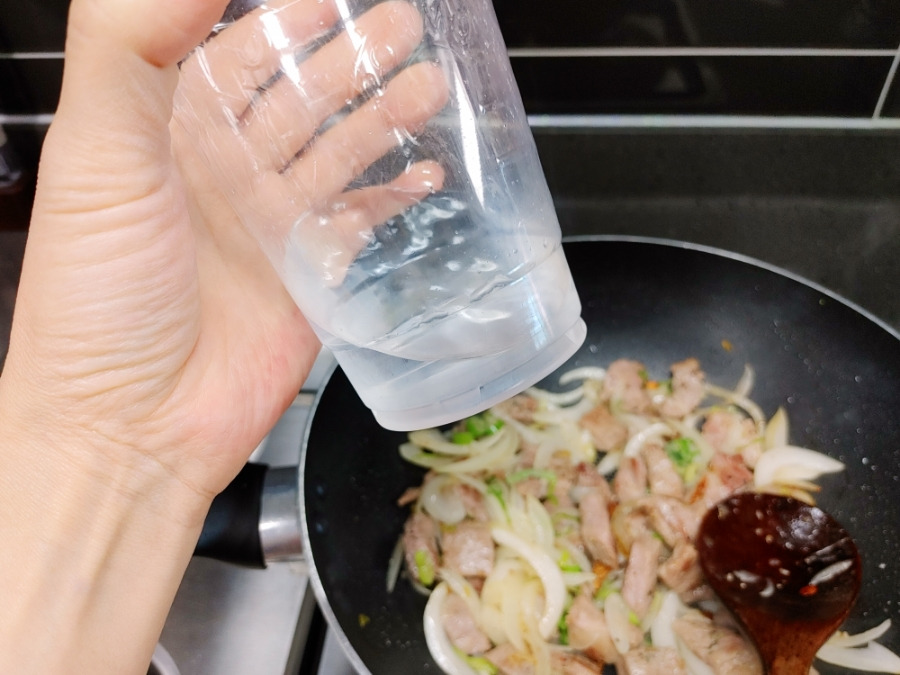 잘 볶아지면 물 조금 넣어줄게요. 야채에서 수분이 조금 나오긴 하지만 너무 뻑뻑하면 짜장 스프가 잘 안 섞이거든요.