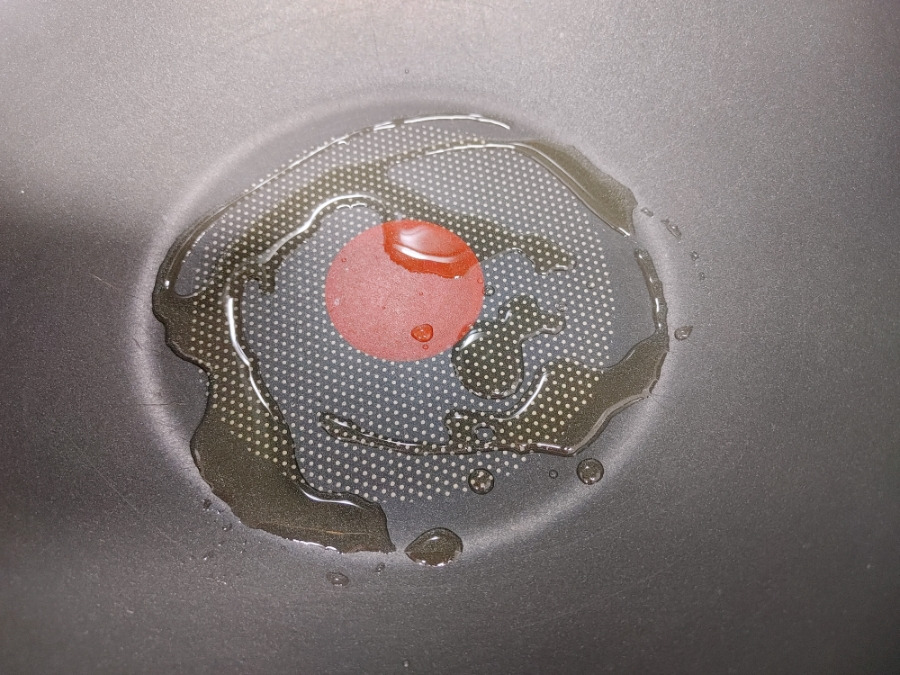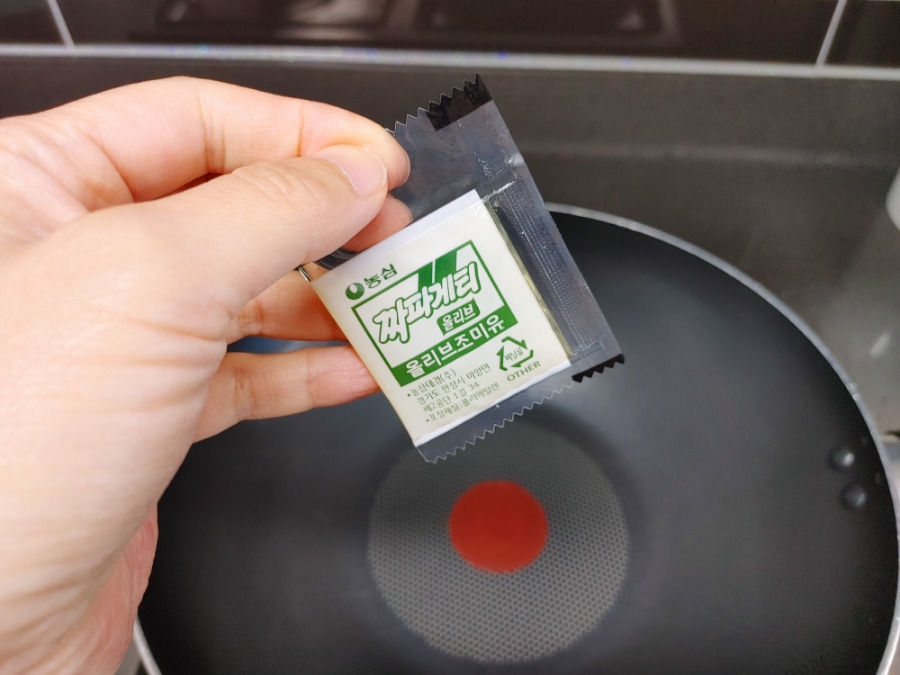 팬에 올리브 조미유 1봉지를 넣고 가열해 줍니다. 올리브조미유는 올리브유와 양파풍미유가 함께 들어있어서 짜장라면의 풍미를 더해주죠. 전 여기에 돼지 목살을 구우려고요. 남은 1봉은 조리 마지막에 후첨으로 넣어서 윤기와 향을 더해줄게요.