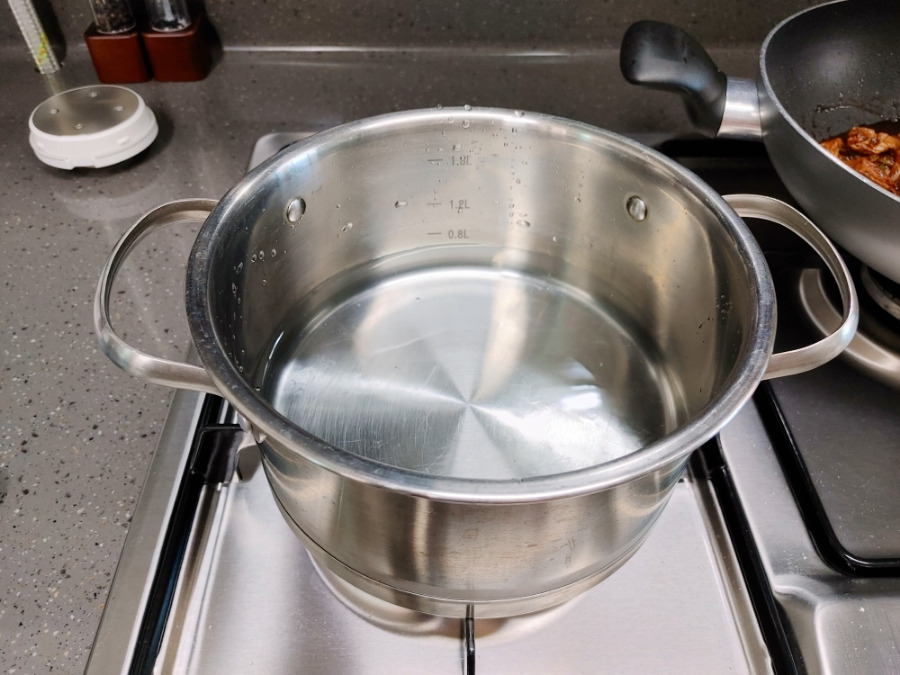 짜장 소스는 완성됐고요. 이제 냄비에 물을 끓입니다. 전 라면 물 따로 안버리고 면수까지 다 쓸 거라서 물 자작하게 넣었어요.
