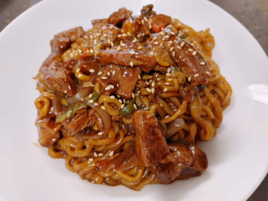 팬트리를 뒤져보니 짜파게티 두 개가 있어서 냉장고에 있는 돼지 목살 스테이크를 조합해 돼지 목살 짜장 스파게티를 만들기로 했습니다. 아시죠? 짜파게티가 '짜장+스파게티'의 조합이라는거요. ㅋ 저희 남편은 37살 인생에 이걸 오늘 처음 알았다네요.
