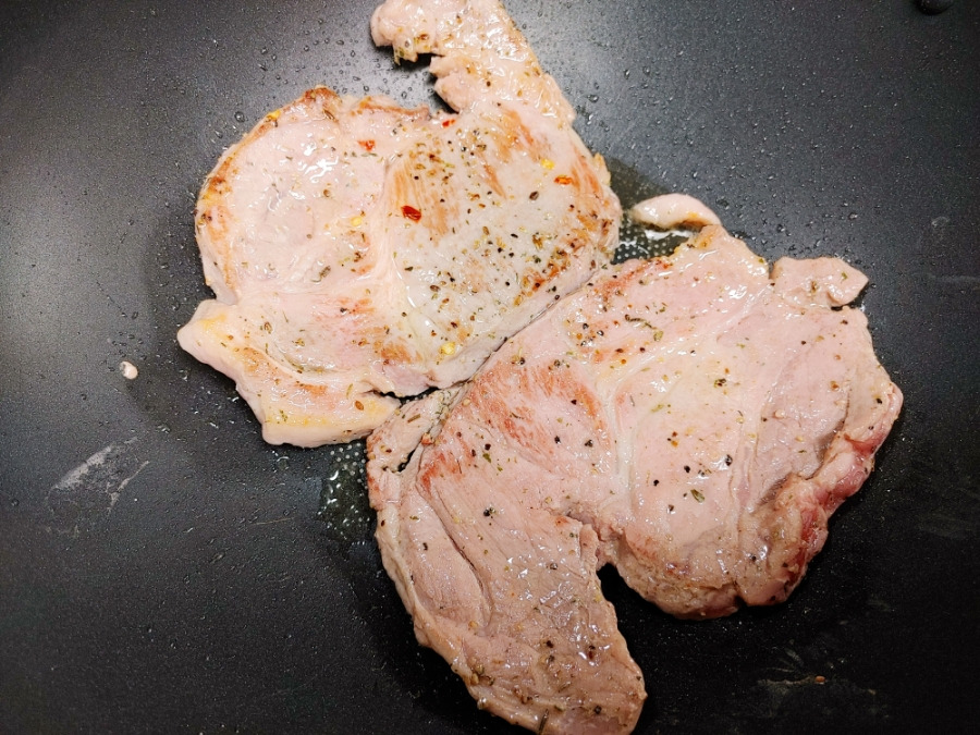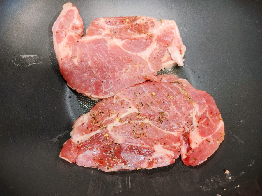 팬이 잘 달궈지면 목살 스테이크를 넣어요. 전 면보다 고기를 더 많이 먹을 예정이라 두 덩어리 다 넣어줬습니다. 진짜 맛있겠쥬? ^^