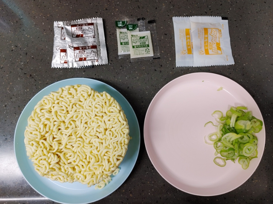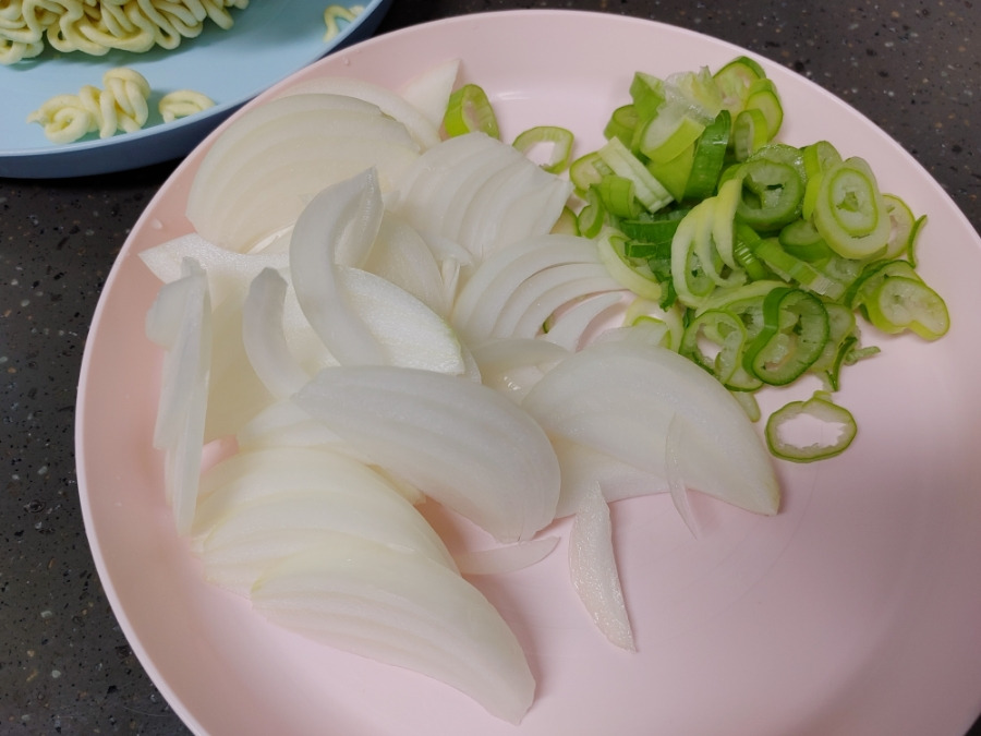 짜장 스프 2개, 올리브조미유 2개, 건더기 스프 2개, 라면 사리 2개, 잘게 썬 파 양껏, 양파 작은 것 1개도 채썰어 넣을 거예요.