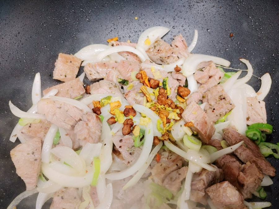 잘 구워진 목살을 가위로 먹기 좋게 자르고 파와 양파를 넣어 함께 볶아주세요.