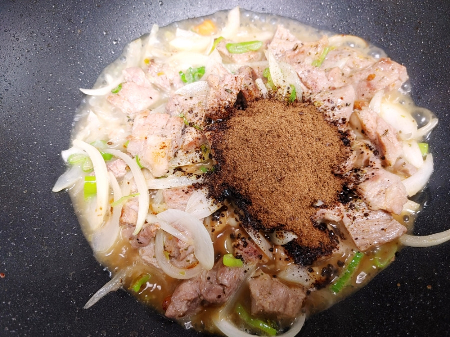 자글자글 잘 끓으면 이제 짜장 스프를 넣을 시간입니다~ 짜장 스프 2개 투하!