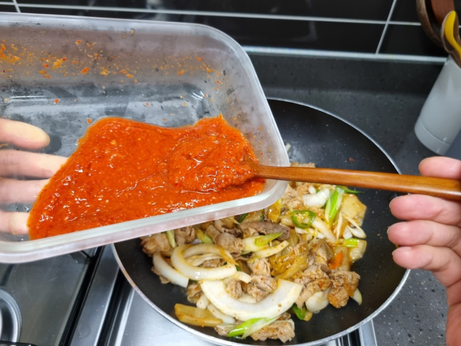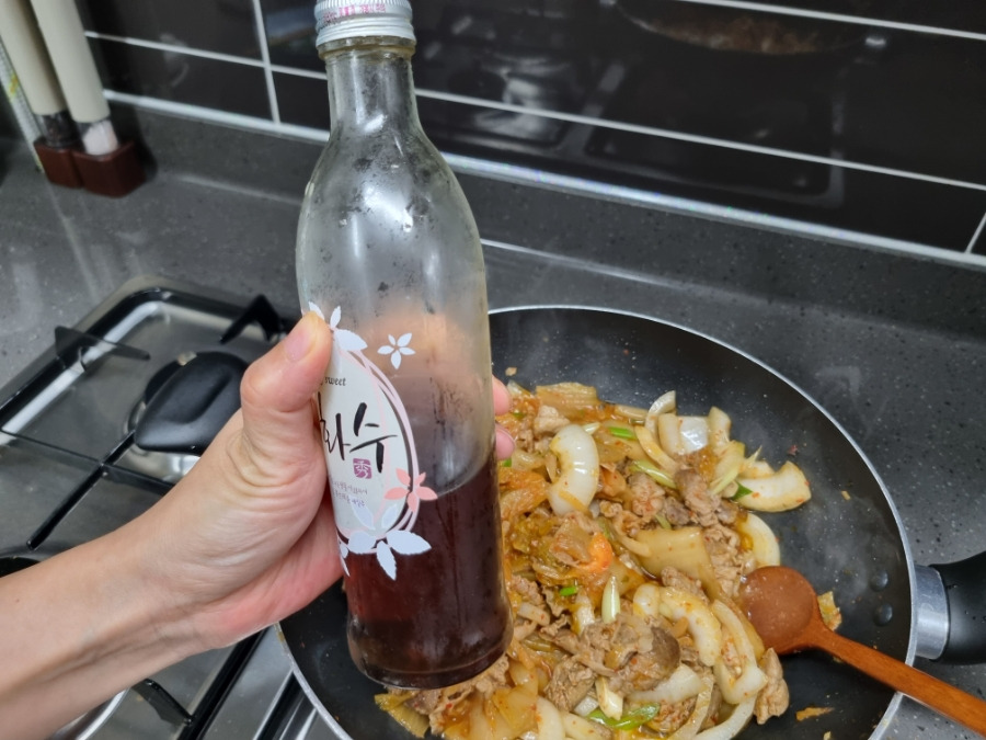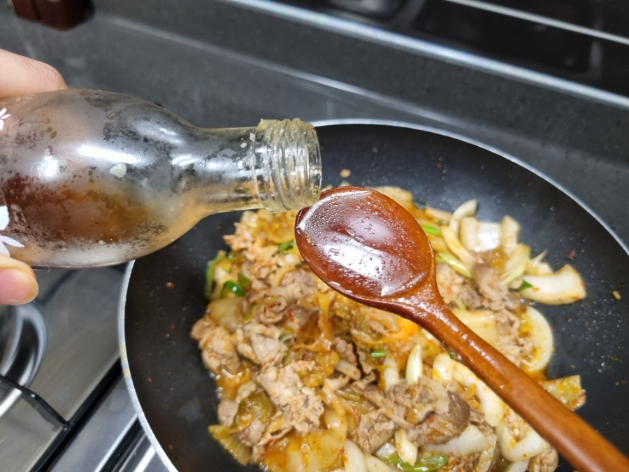 이건 석박지 국물인데요. 생강, 마늘, 양파가 곱게 갈려있고 걸쭉해서 다진 양념처럼 쓸 수도 있고 찌개나 볶음 요리에 넣으면 더 맛있어져요. 전 석박지 국물 한 스푼 반 넣었어요. 집에 남은 김치 국물 있으면 버리지 마시고 저처럼 국이나 찌개, 볶음 할 때 써보세요.