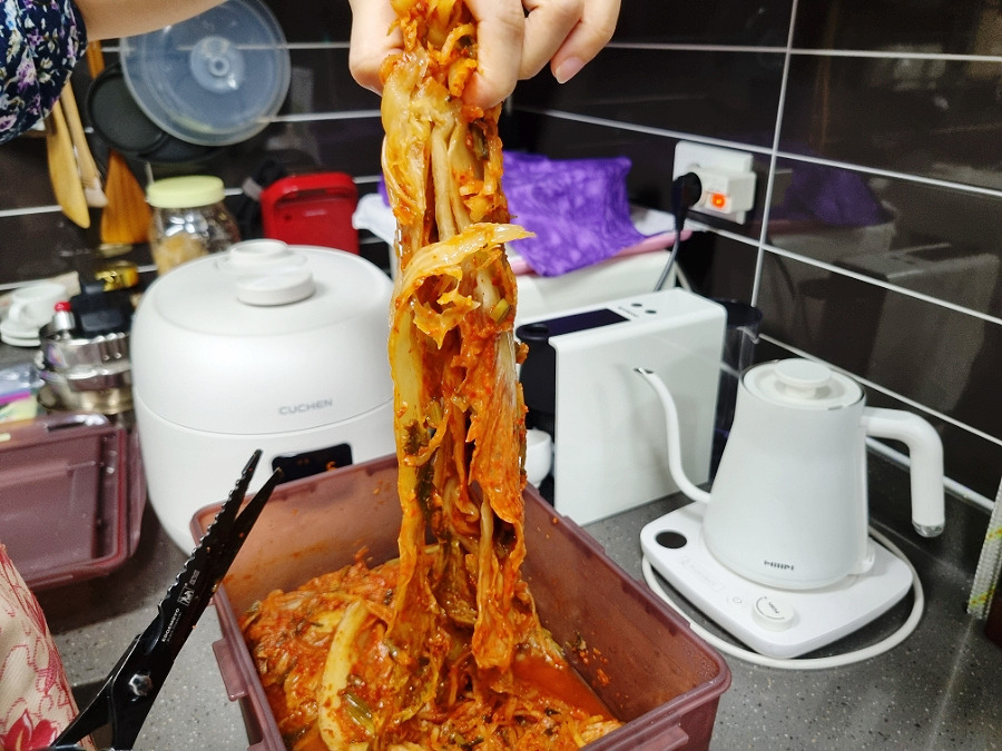 이거 작년에 담근 시어머님 표 김장김치인데 진짜 잘 익었어요. 새콤하고 약간 콤콤한 느낌도 나면서 감칠맛있는 이 맛. 찌개나 볶음에 딱입니다. 가위로 숭덩숭덩 썰어줄게요.