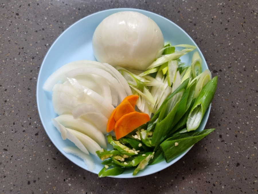 함께 볶아줄 야채 친구들, 양파, 당근, 대파, 고추를 먹기 좋게 썰어줬어요.