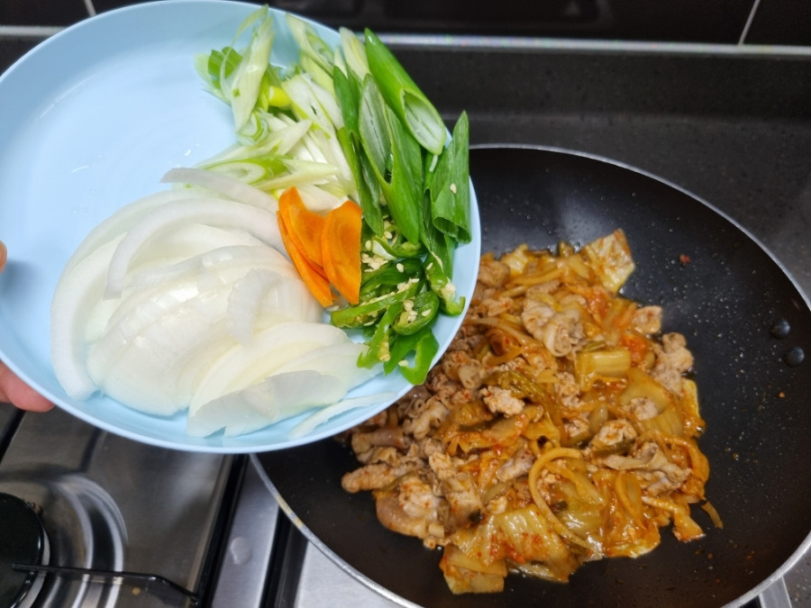 고기와 김치가 어느 정도 볶아지면 준비한 야채를 넣어주세요.