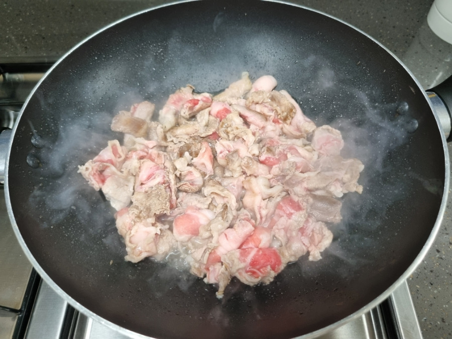 달궈진 팬에 냉동대패삼겹살을 들이부어! 촤라라라ㅏㄹ라라ㅏ랏~하면서 연기가 피어오릅니다.