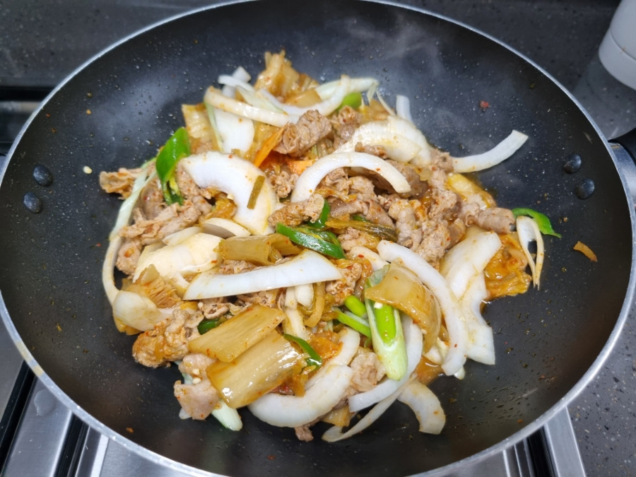 이대로 조금 더 볶아주시면 맛있는 냉동삼겹살김치볶음 완성입니다. 부엌에 맛있는 냄새가 가득찼어요. 김치 요리 좋아하는 남편은 콧구멍을 벌름거리고 있고 아이들도 맛있겠다고 난리입니다.