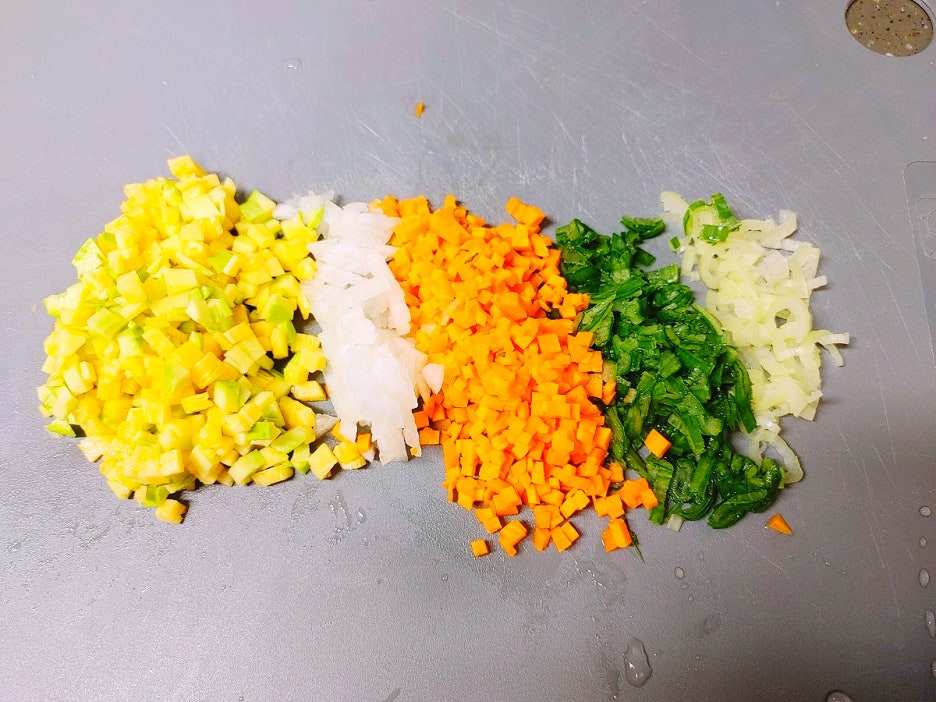 먼저 냉장고에 있는 야채들을 꺼내 잘게 다져요. 야채전이 좋은 점이 냉장고 털이가 되면서 야채를 다양하게 많이 맛있게 먹일 수 있다는 점이죠. 저는 애호박, 양파, 당근, 대파를 잘게 다져줬어요. 계란전은 빨리 익으니까 당근처럼 단단한 재료는 좀 더 잘게 다져주는 게 좋겠죠? ^^