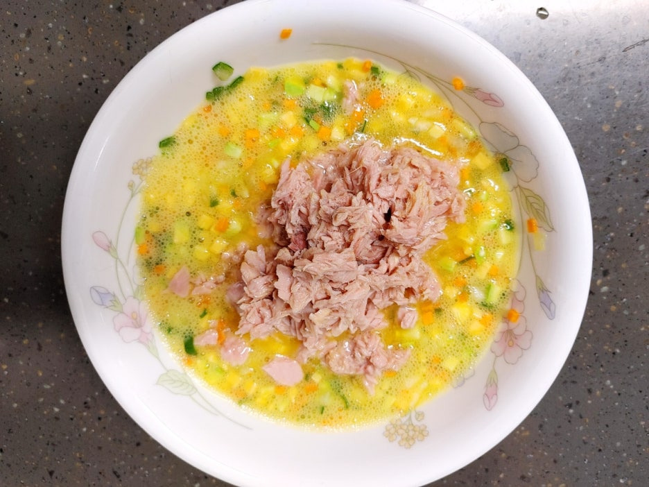 참치캔을 오픈해서 기름을 빼주시고 계란야채와 함께 섞어요.