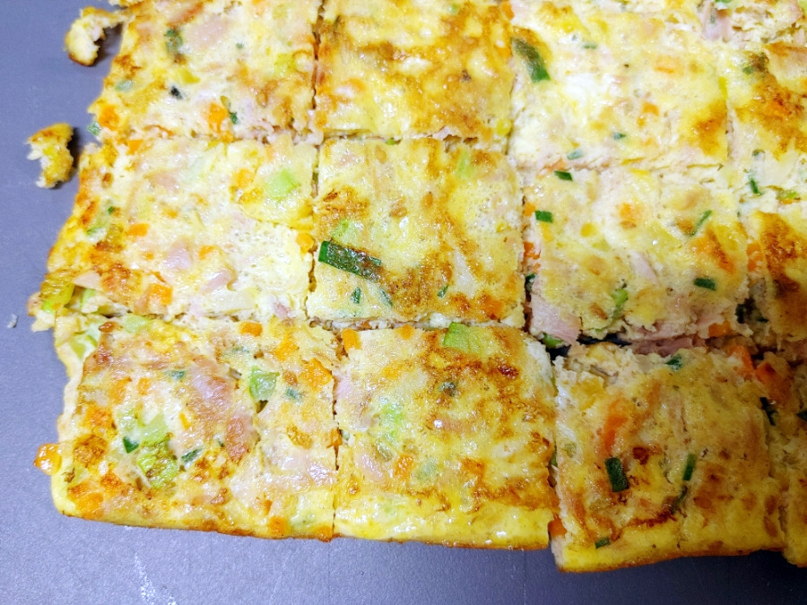 맛있게 잘 부쳐졌어요. 네모지게 썰어줄게요.