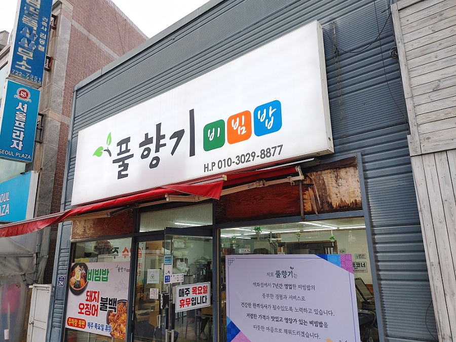 '풀향기'는 백화점에서 7년간 영업한 비빔밥의 풍부한 경험과 서비스로 건강한 한 끼 식사를 제공하고 있어요. 저렴한 가격과 맛있고 영양가 있는 비빔밥을 따뜻한 마음으로 채워 드리겠다는 주인의 마음이 음식을 통해 엿보입니다.