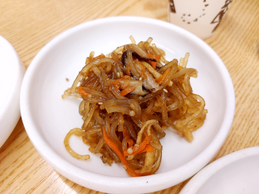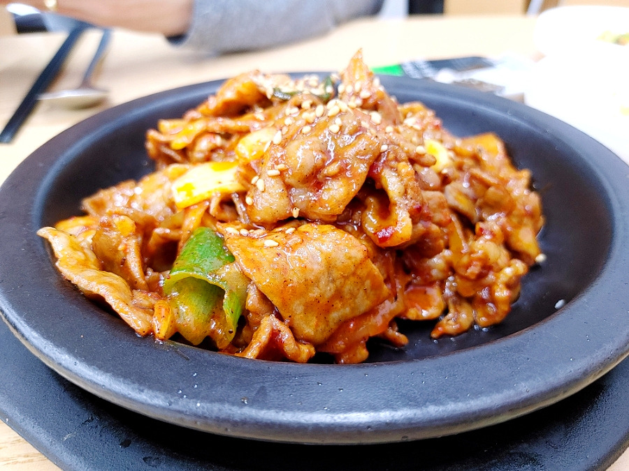 비빔밥 세트에 함께 나온 제육볶음. 그냥 곁들이는 정도가 아니라 양이 푸짐하게 나와요. 제대로 된 1인용 제육볶음입니다. 비빔밥에 넣고 함께 비벼 먹거나 반찬으로 곁들여 먹으면 와~ 최고예요. 제육볶음은 많이 맵지 않아서 맵찔이인 저도 맛있게 먹었어요.