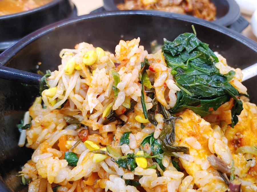 이곳에서 사람들이 가장 많이 시켜 먹는 메뉴를 관찰했더니 비빔밥+제육볶음+김치찌개 세트였어요. 이 구성이 2인 세트에 15,000원이라니 믿어지시나요? 밑반찬도 무려 6가지가 나옵니다.