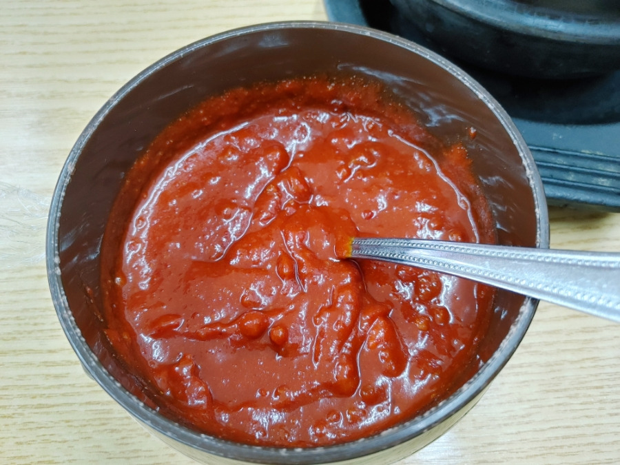 비빔장이 따로 준비되어 있어요. 비빔장을 넣고 쓱쓱 비비면 아래에선 지글지글 돌솥이 끓으며 밥알 눝러붙는 소리가 들려요. 비비면서 눈도 즐겁고 귀도 즐겁고, 입에는 침이 고이는 그런 상황. 얼른 먹고 싶어져요.