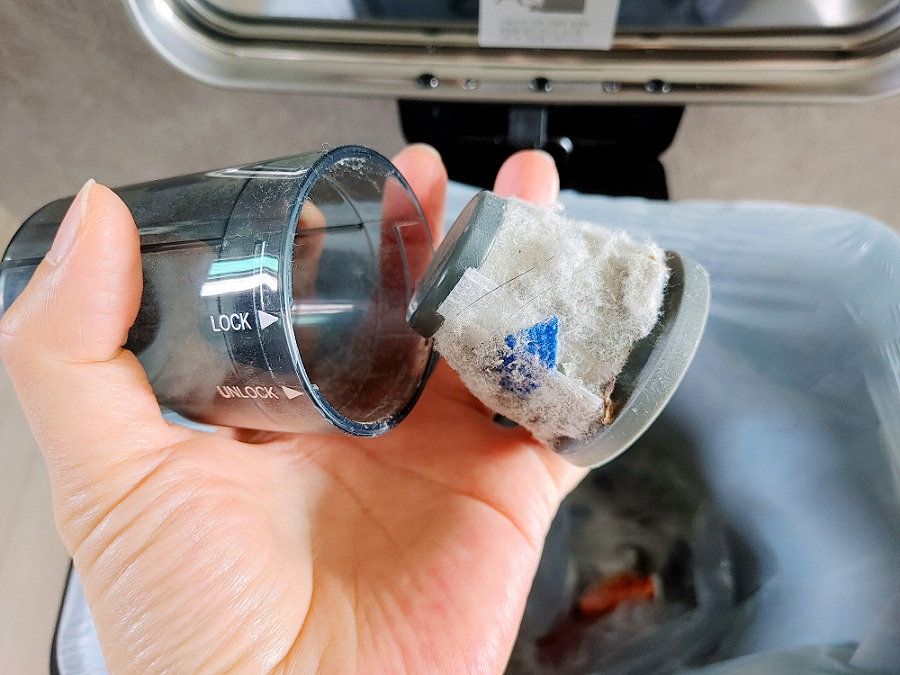 본체와 흡입구를 분리한 후 필터를 꺼내 먼지를 제거해 주면 되는데요. 큰 먼지는 손으로 떼고 미세 먼지는 메인 청소기로 흡입 시킵니다. 간편하쥬~~ 필터에 먼지 쌓인 것 좀 보세요. 속이 다 시원하네요.