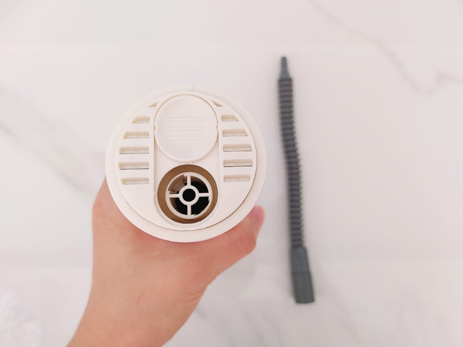 에어 블로우 기능이 있는데 청소기를 뒤집으면 아래에 동그란 버튼 같은 거 있어요. 이걸 밀면 구멍이 나옵니다. 여기에 에어노즐을 끼우면 에어 블로우 기능을 쓸 수 있어요. 에어 블로우는 실내에서 쓰면 어차피 먼지 다 들이마시고 다시 청소해야 하니 잘 사용하진 않는데요. 시험 삼아 써봤더니 에어 블로우 힘이 생각보다 세더라고요. 차량 대시보드 청소에 사용해 볼까 고민 중입니다. 좋은 아이디어 있으면 알려주세요.