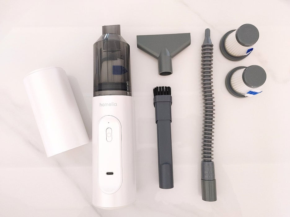 그럼 홈리아 미니 무선 청소기의 구성을 알아볼게요. 필터가 장착된 청소기 본체, 틈새 브러시 + 솔 브러시(결합 상태), 에어 노즐, 와이드 브러시, 추가 필터 2개, 설명서와 C 타입 충전 케이블이 들어있어요.
