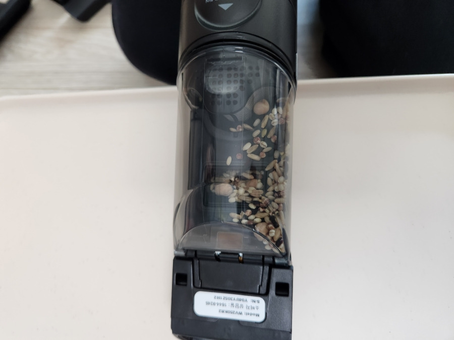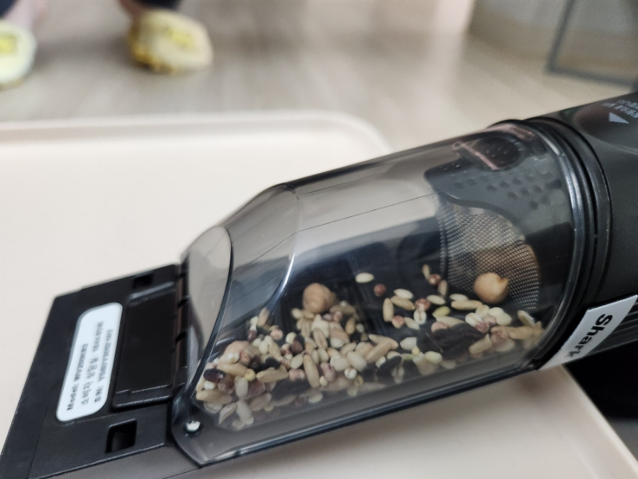 약 42cm의 길이로 제 팔뚝보다 슬림 하면서도 가볍고 강해요. 집에 있는 잡곡과 콩을 흡입시켜봤는데 핸디 청소기임에도 큰 청소기처럼 싹~~ 시원하게 빨아들이더라고요. 쾌감 쩔!!