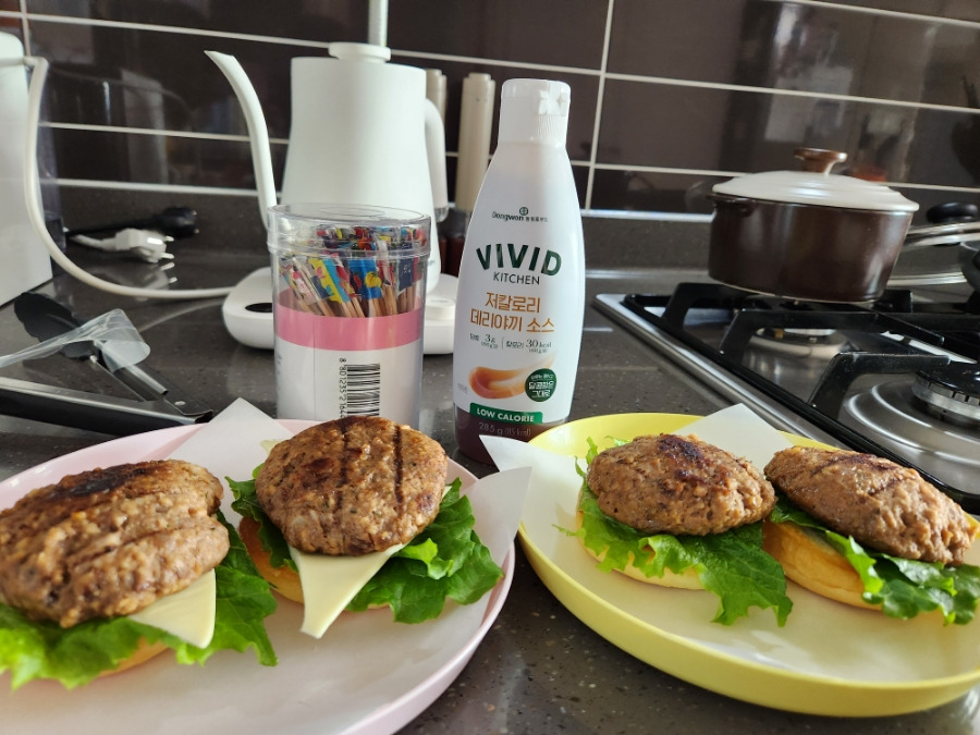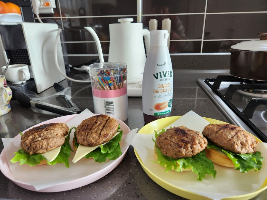 아이들이 시중에 파는 버거 중 제일 좋아하는 게 롯데리아 '데리버거'인데요. 짭잘하고 감칠 맛 나는 소스 맛으로 먹는 버거라 할 수 있죠. 그래서 오늘은 특별히 '홈메이드 미니 데리버거'를 만들어 보기로 했어요. 필요한 재료는 버터롤, 상추, 고다치즈, 올가 한우와 국산 돼지고기로 두툼하게 만든 육즙 그릴패티 그리고 화룡점정이 될 '비비드키친 저칼로리 데리아끼 소스'입니다.