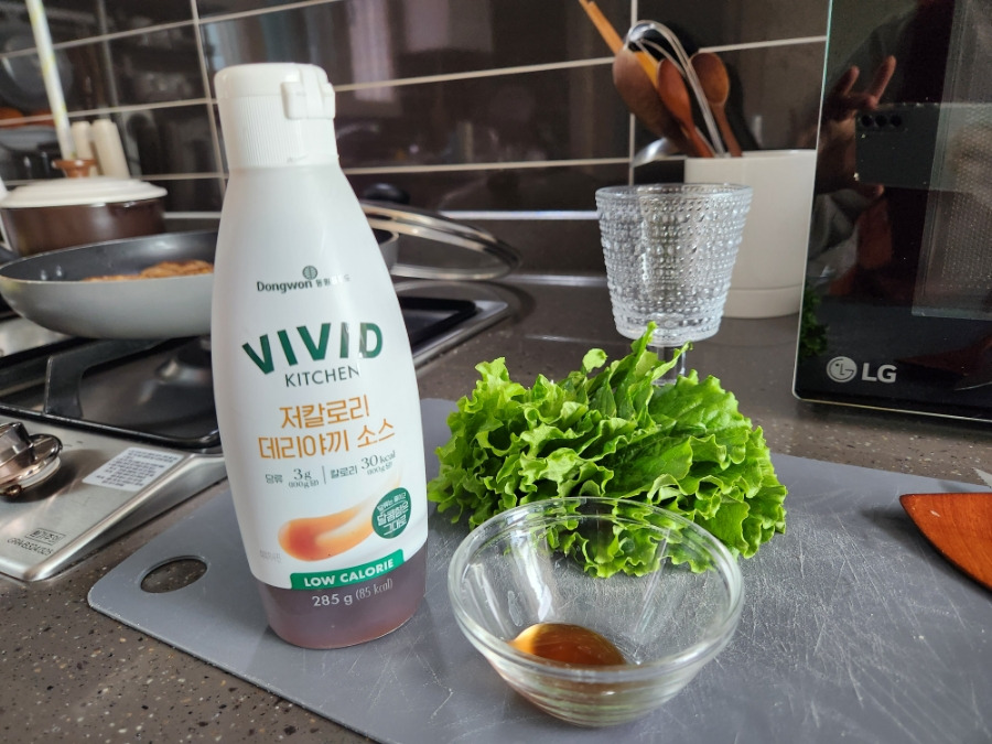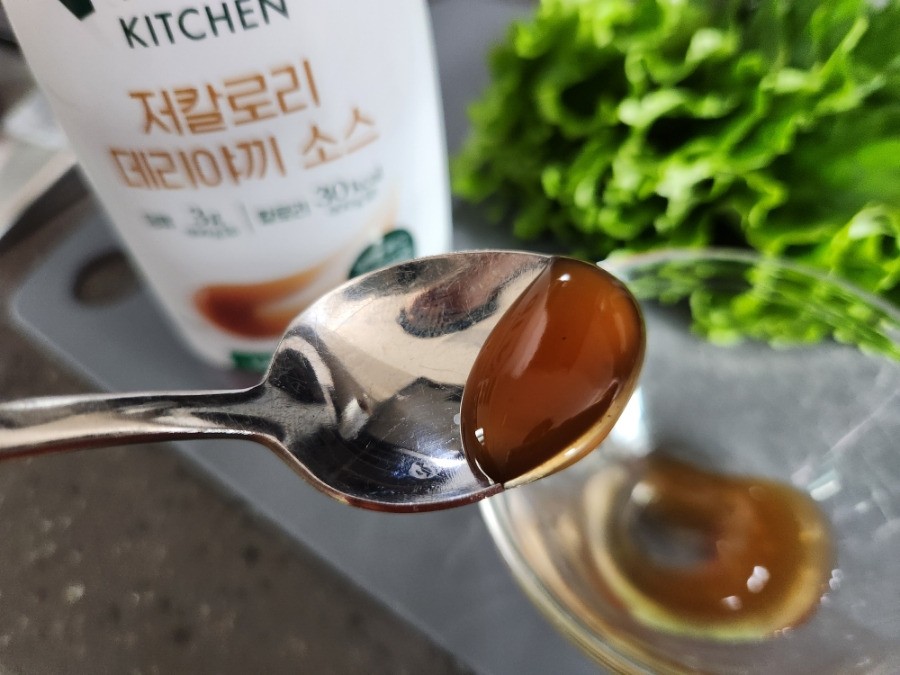 비비드키친 저칼로리 데리야끼 소스의 맛은 시중 데리야끼 소스와 비슷하지만 제 입맛엔 짠 맛은 조금 약하고 감칠맛은 더 풍부하게 느껴졌어요. 다시마엑기스, 가쓰오조미액, 아미노베이스 등 감칠맛을 내는 성분이 덕분인 것 같아요. 농도는 많이 뻑뻑하지 않고 정말 롯데리아 데리버거 소스와 비슷해요.