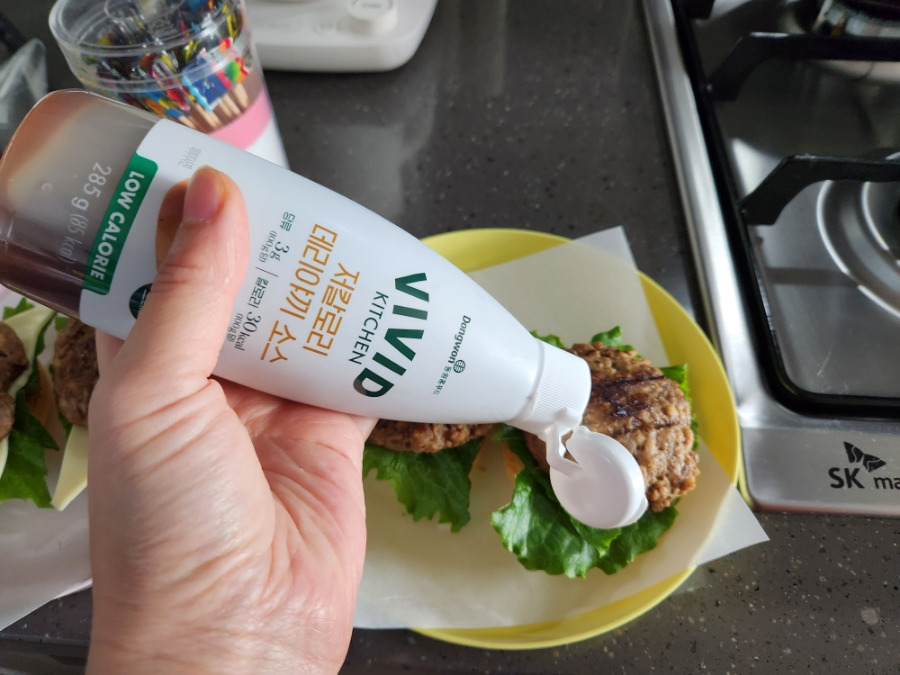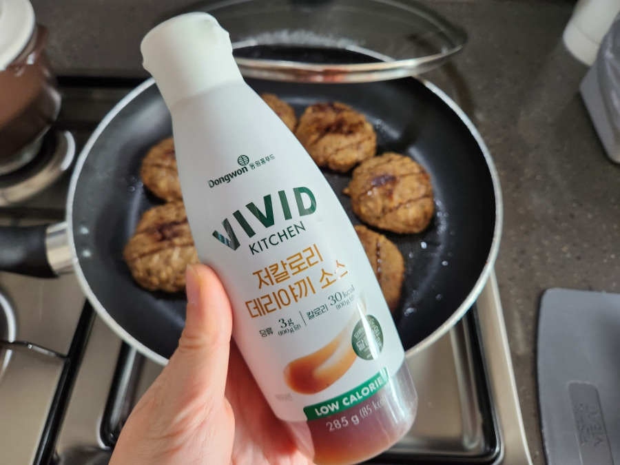 5. 패티 위에 '비비드키친 저칼로리 데리야끼 소스'를 한 티스푼 올려주세요.