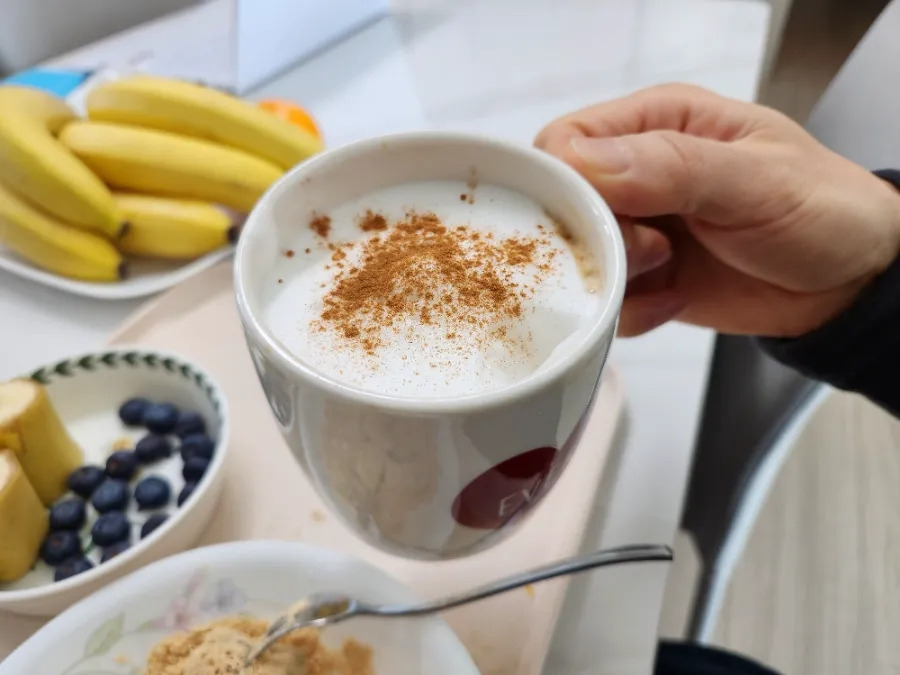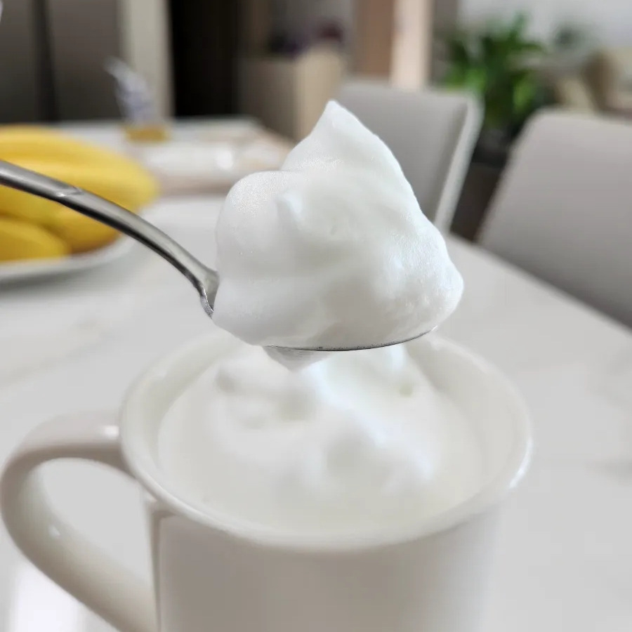 90초 만에 폭신하고 따뜻한 우유거품이 만들어졌어요. 일반 라떼보다 거품이 촘촘해서 밀도있는 거품을 즐기시는 분들께 적합할 것 같아요. 이렇게 숫가락으로도 예쁘게 떠질 정도에요. 폼이 오랫동안 지속되서 커피를 다 마실 때까지 거품을 즐길 수 있어요. 코코아 파우더를 뿌려주면 아이들이 참 좋아할 것 같아요.