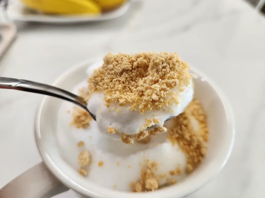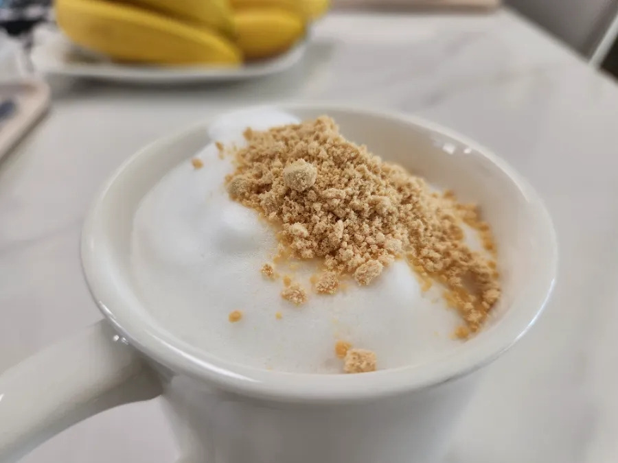 저는 아침 식사로 먹고 남은 인절미 콩고물이 있어서 함께 먹어보았어요. 우유 거품과 콩고물의 조합이 색다르고 좋았답니다. 잘 섞어주면 고소한 두유가 되지요.