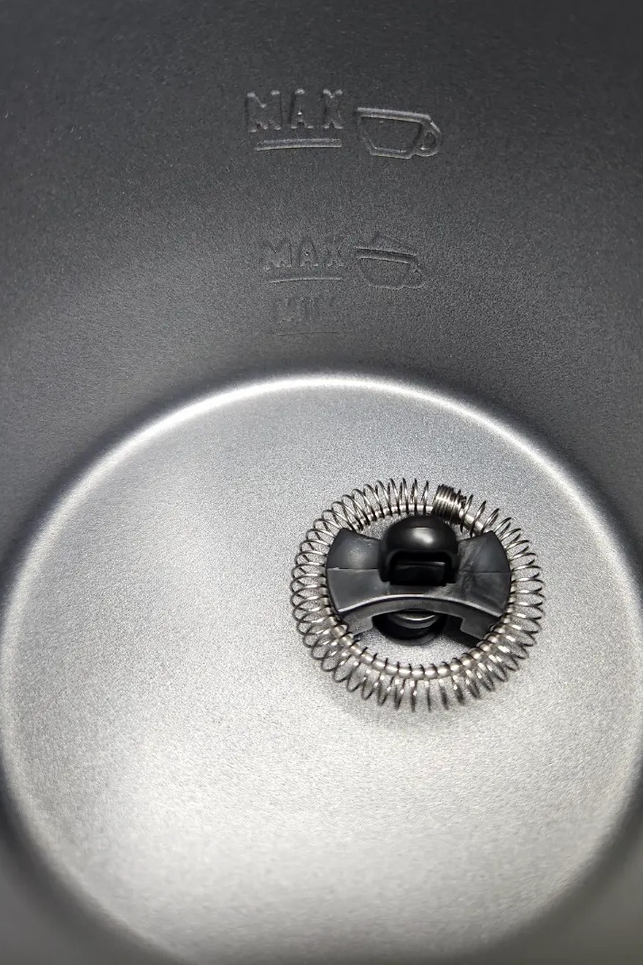 본체 안을 살펴보면 아랫쪽부터 총 세 개의 선이 보이는데요. 아랫쪽 MIN/MAX는 우유 거품용, 윗쪽 MAX는 우유 데우기용 선입니다. 적은 양의 우유로도 풍성한 거품이 만들어지기 때문에 잘 구분해 주세요. MIN에 맞춰 우유를 부으면 라떼 1잔 분량의 거품이 만들어집니다.