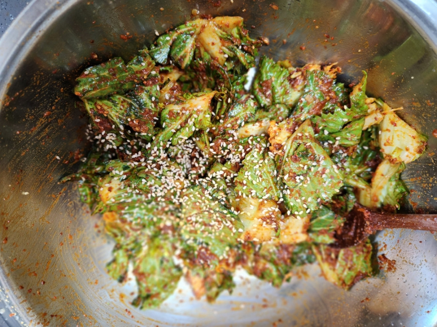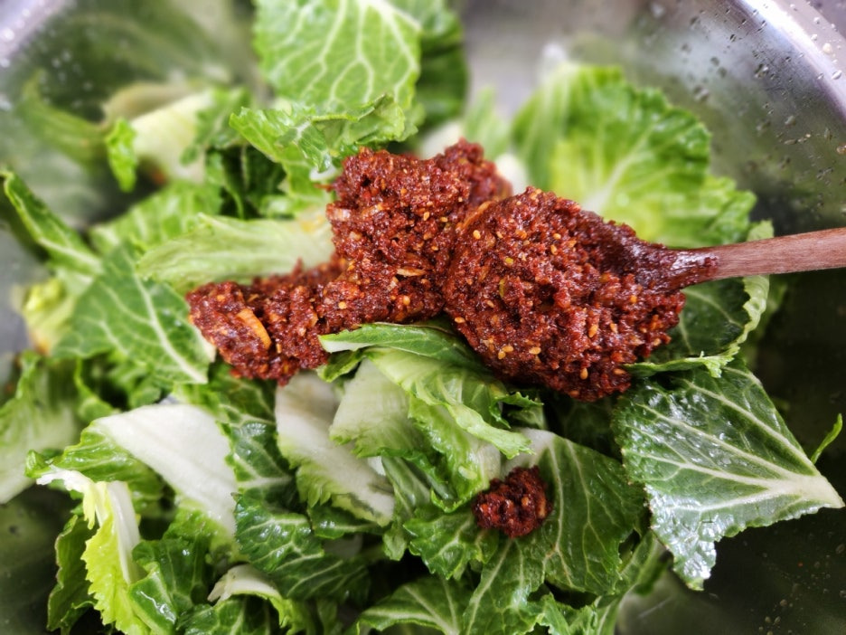 4. 봄동에 양념을 올리고 잘 버무려줍니다.