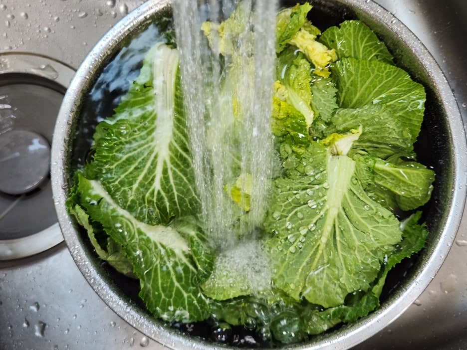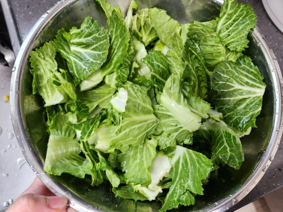 1. 봄동은 잎을 하나씩 떼서 물에 담가 깨끗이 씻어주세요.
