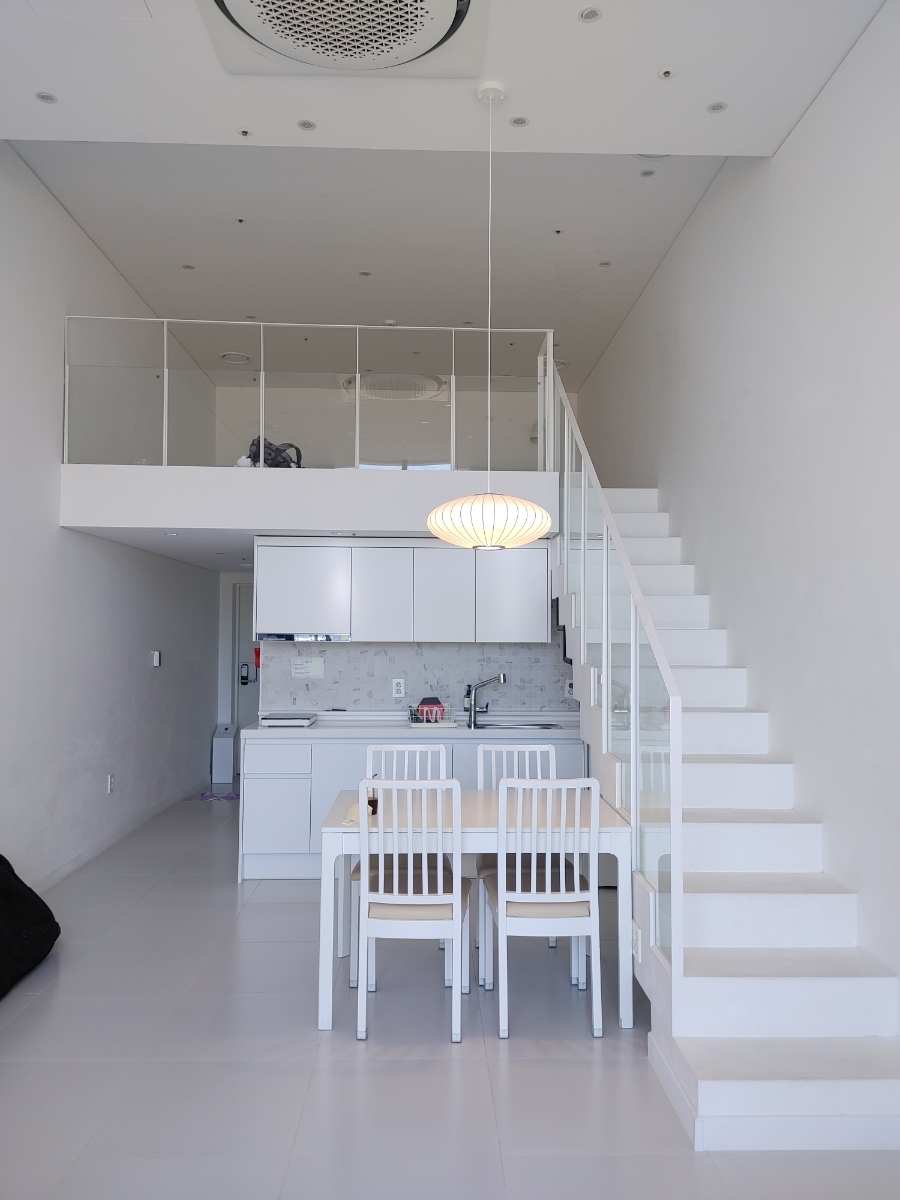 올 화이트의 심플 모던한 실내 인테리어, 애들이 신나서 단숨에 계단을 뛰어 올라간다.