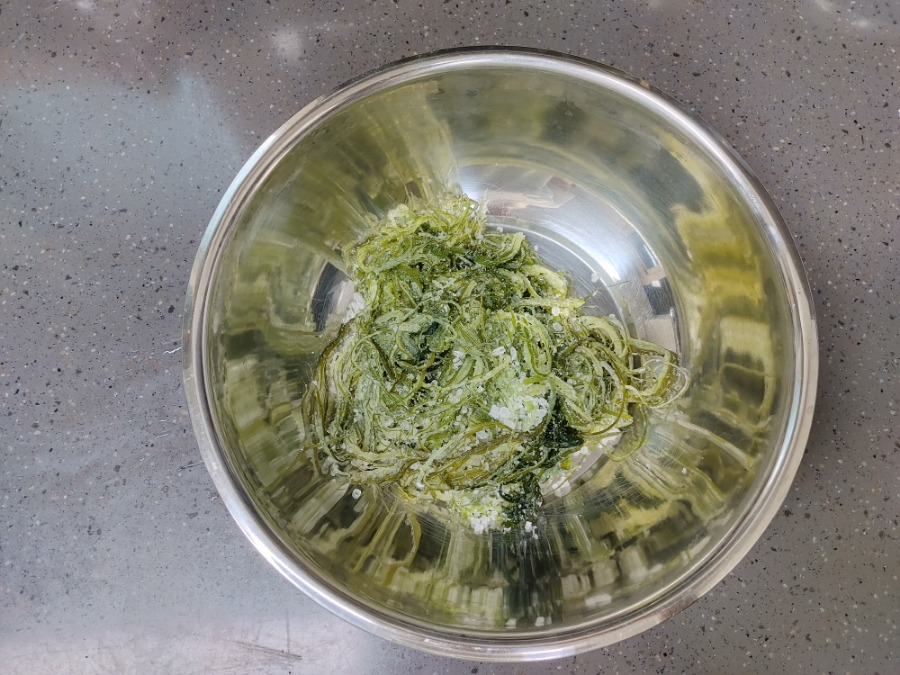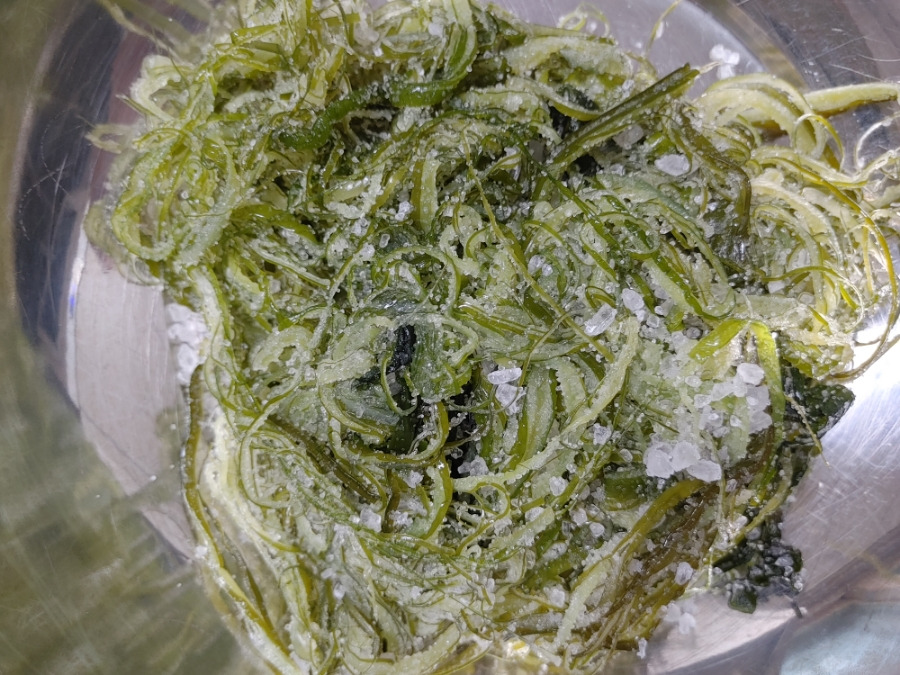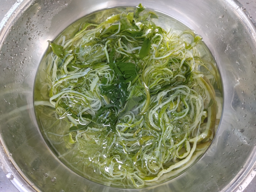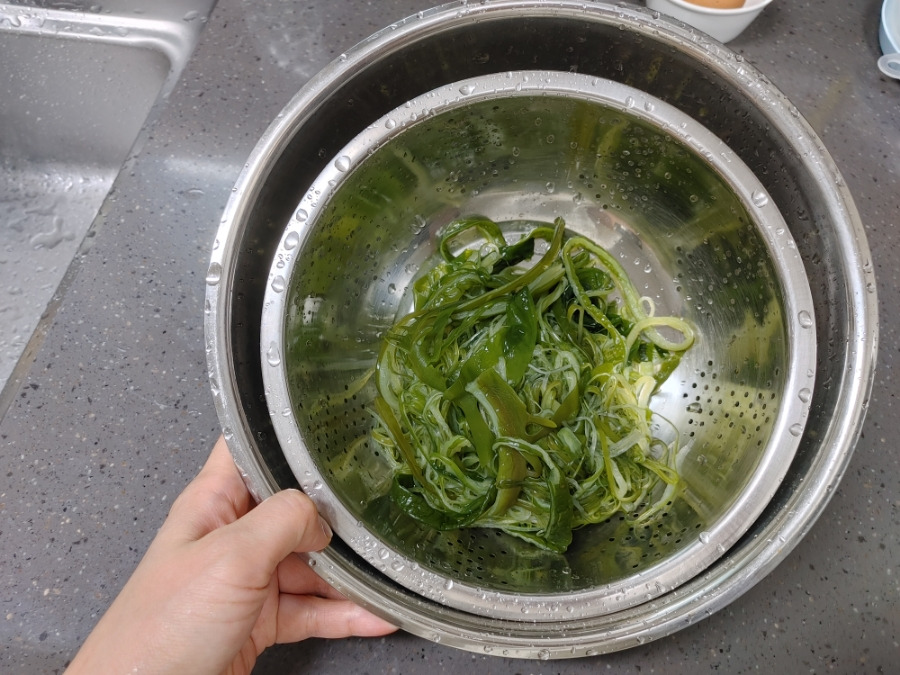 1. 짠기를 뺀 미역줄기를 먹기 좋게 가위로 잘라주세요.
