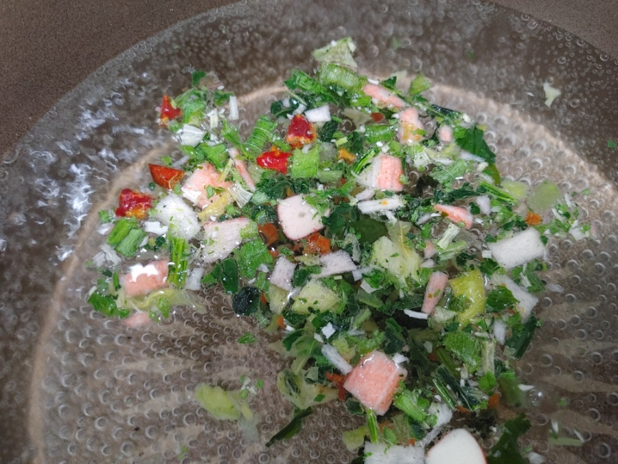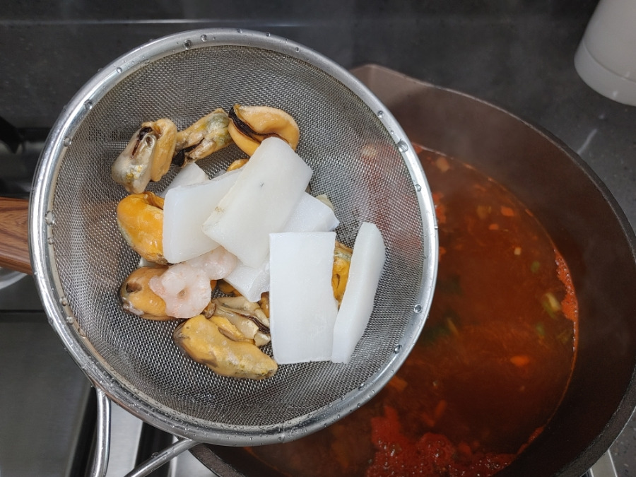 오징어, 홍합, 바지락, 홍새우살이 들어있어요.