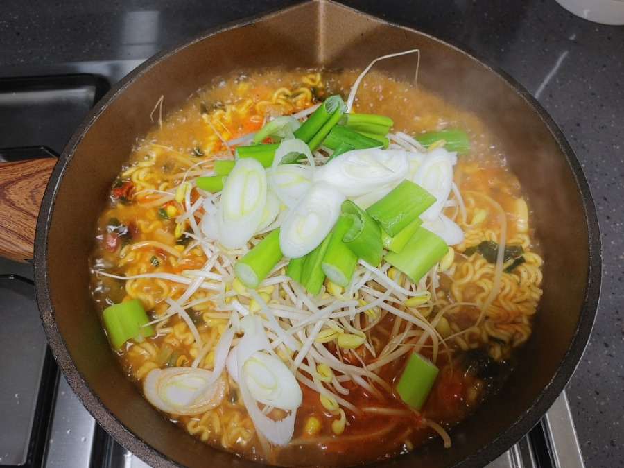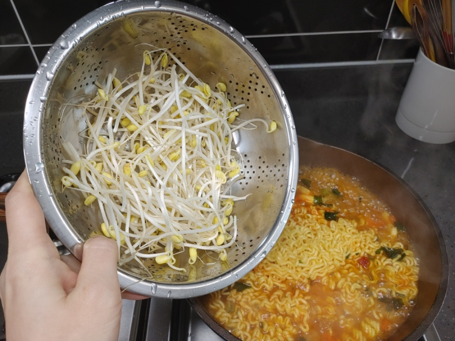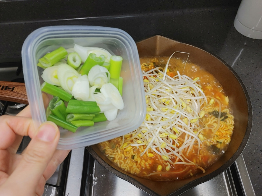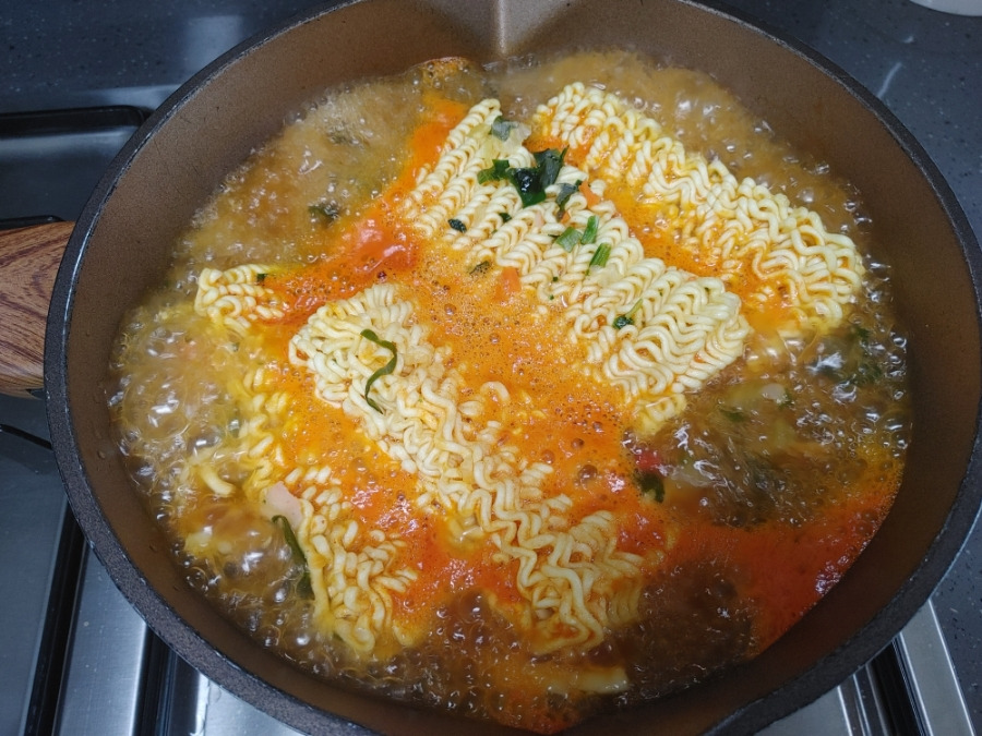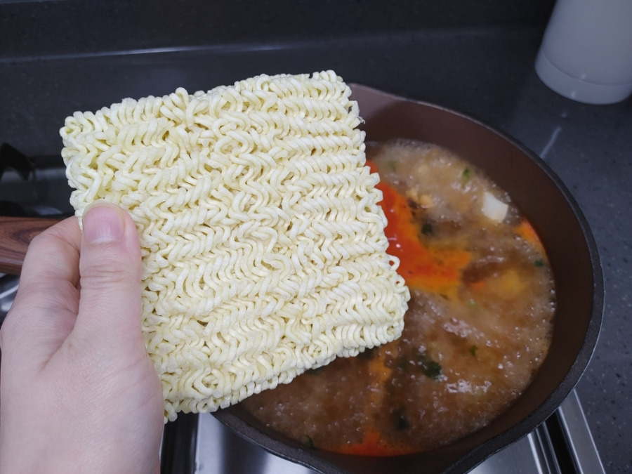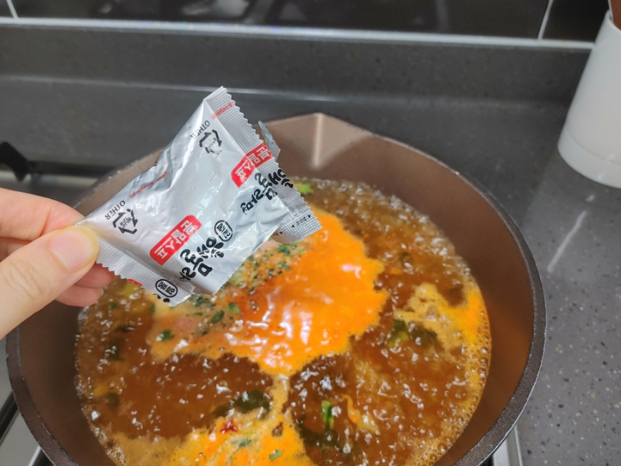 찬물에 건더기 스프부터 넣고 시작하는데요.