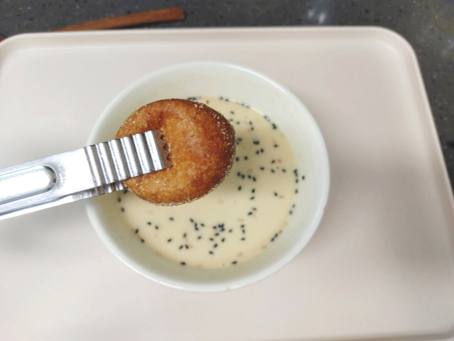 찹쌀 도너츠를 가위로 잘라서