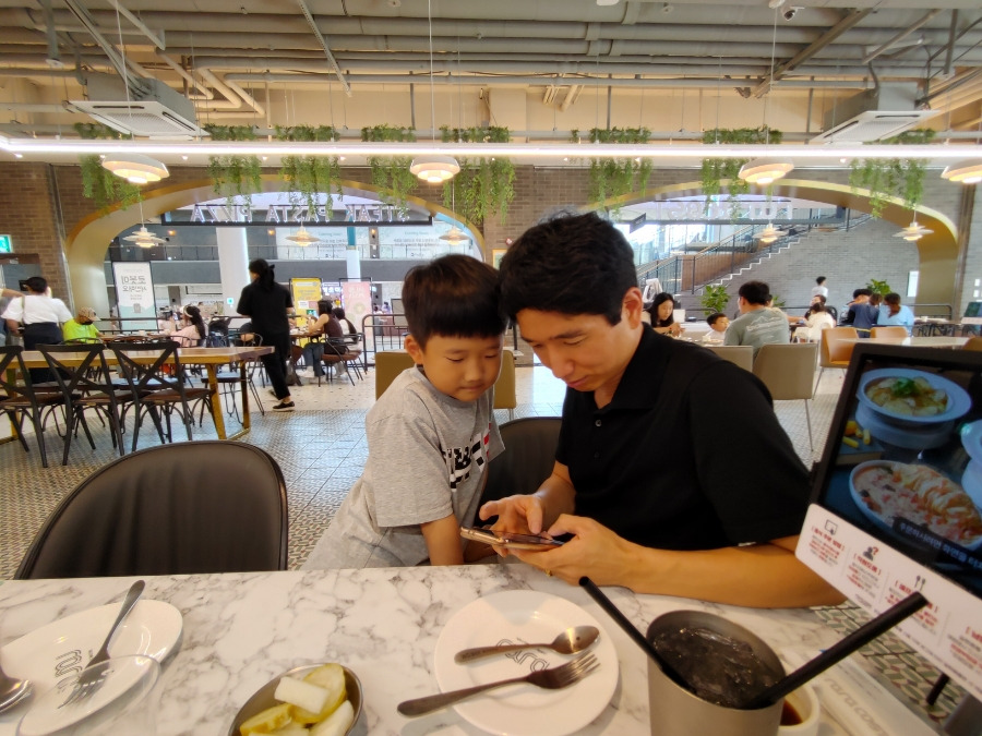 식사를 기다리며 모두들 핸드폰 하는 중.