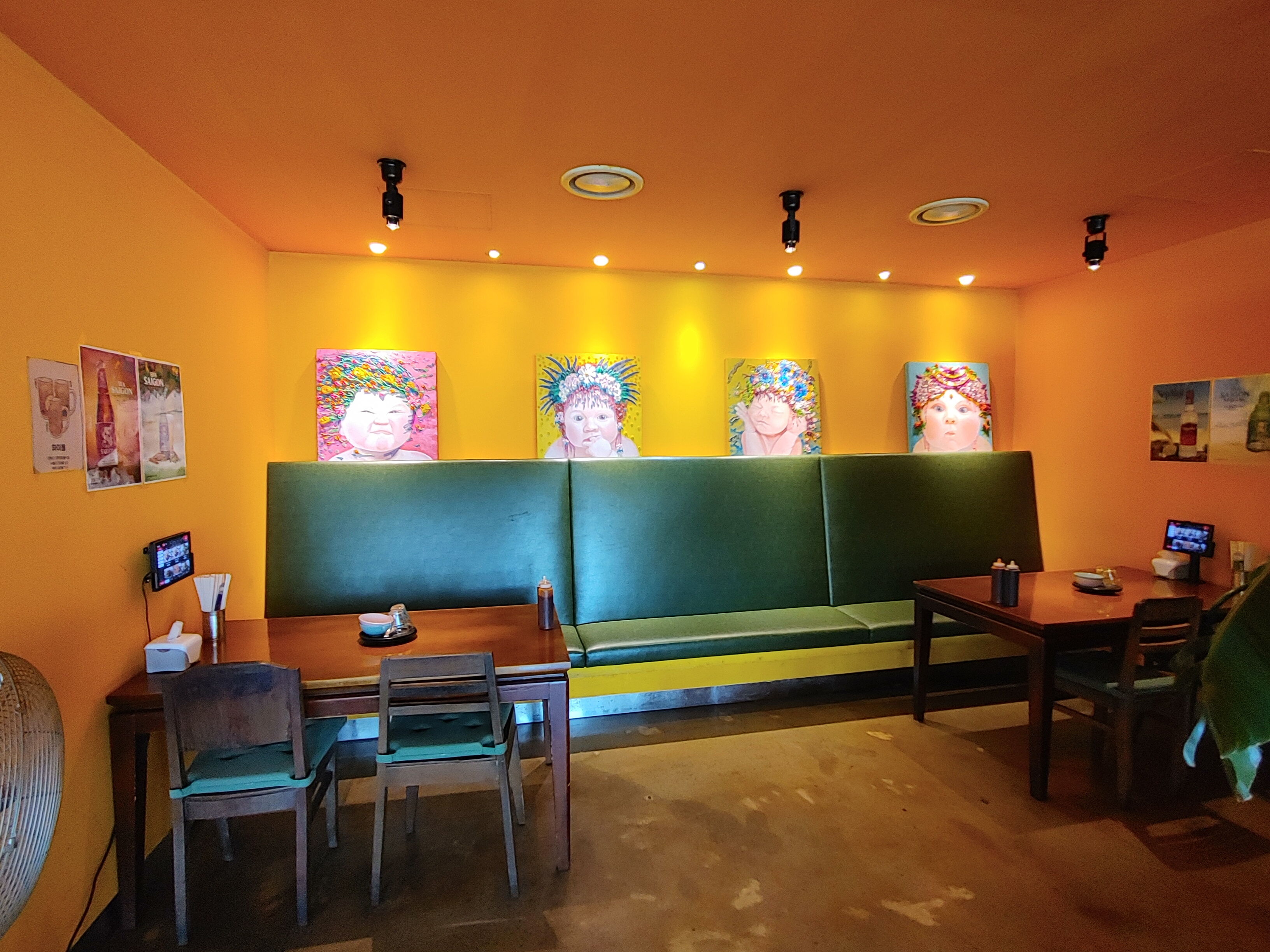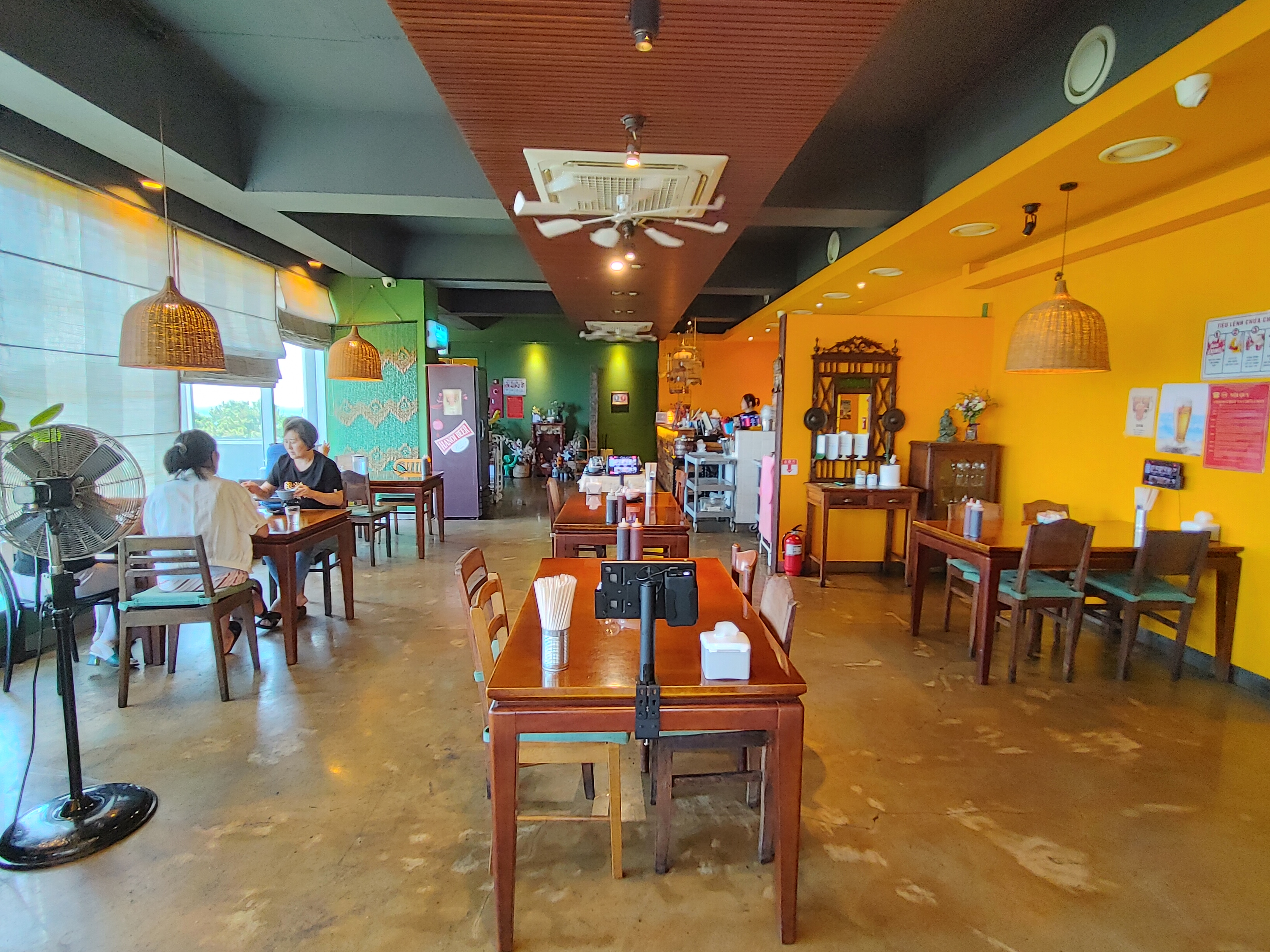 출입문과 같은 노란색의 식당 내부가