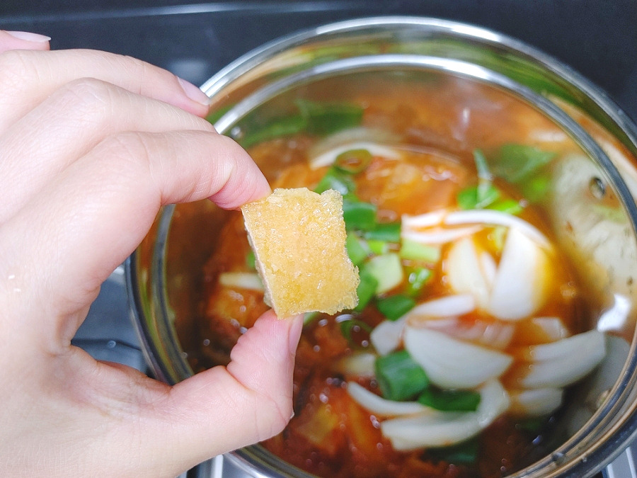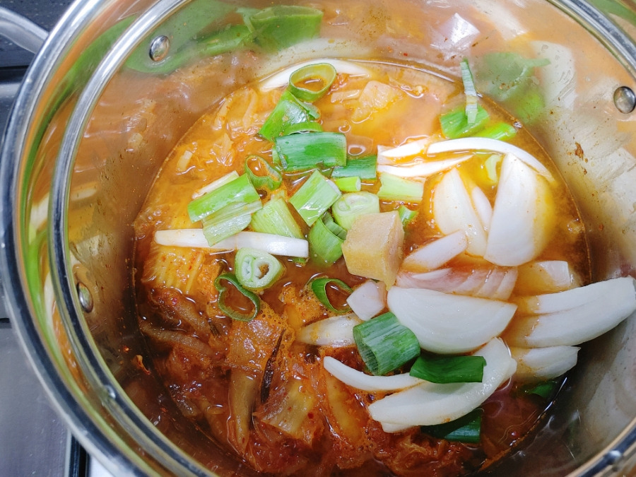 양파, 파, 김치국물을 기호에 맞게 넣어요.