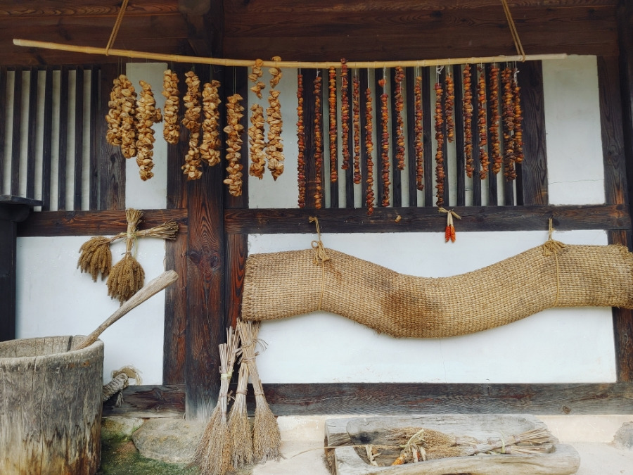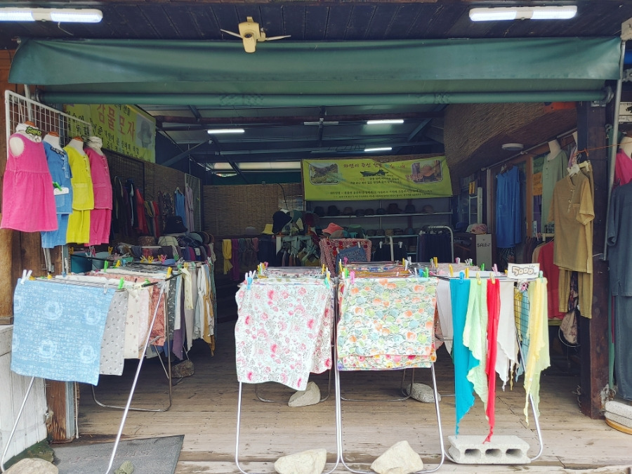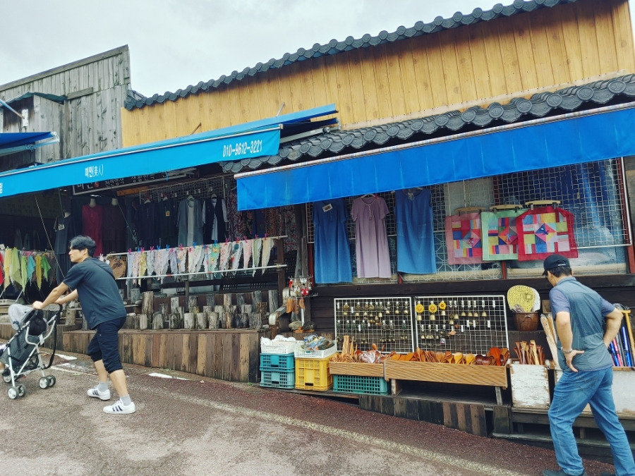 주차장도 잘 완비되어 있고 매표소에서 표를 끊고 최참판댁까지 올라가는 길엔 여러 상점들이 즐비했다. 천연 염색을 한 생활 한복과 소품들, 하동 특산물부터 갖가지 간식거리, 카페가 즐기게 관광객의 눈을 사로잡는다. 아이들과 함께라면 뭐 하나 안 사주고는 지나치기 어렵다. 우리는 녹차 쫀듸기와 콩 유과, 뻥튀기 등을 사서 나눠먹었다. 그중 갓 튀긴 뻥튀기와 콩 유과가 정말 맛있었다. 뻥튀기 집 아저씨가 매우 유쾌하시고 사던 안 사던 갓 튀긴 뻥튀기 하나씩 나눠주시니 꼭 저기 앞을 지나가보자.