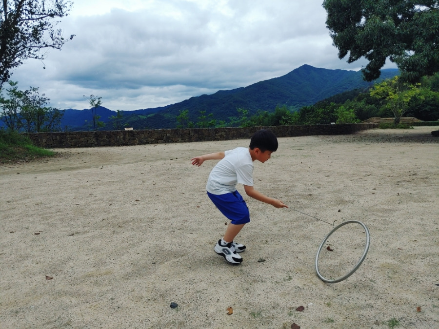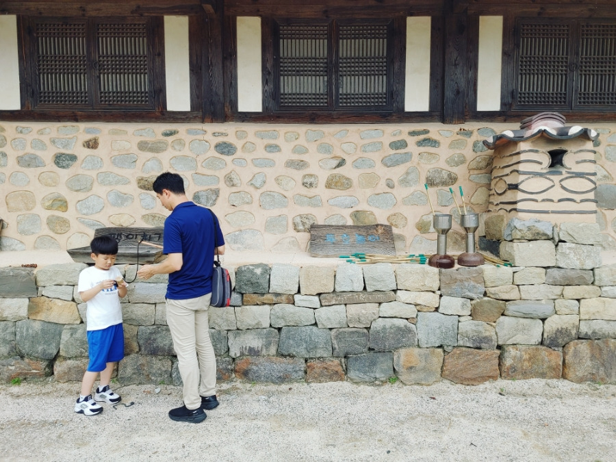 최참판댁 입구에는 관광객들이 전통놀이를 즐길 수 있도록 다양한 놀이 기구를 준비해 두었다. 나무로 만든 팽이, 투호, 굴렁쇠까지 요즘 어린이들이 접하기 어려운 것들이다. 옛 세대의 어른들에게는 추억을 불러일으키는 놀이기도 하다. 칠순이 넘으신 아버지가 마치 어린 소년으로 돌아간 듯 굴렁쇠를 열심히 굴리셨다.