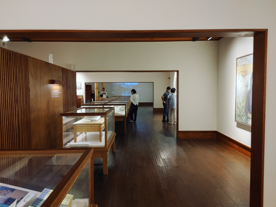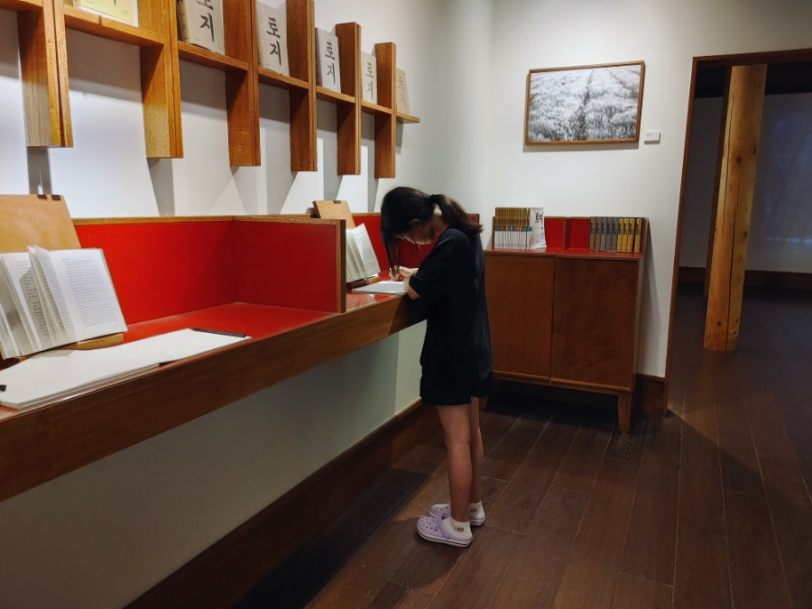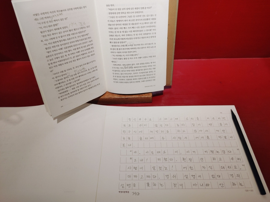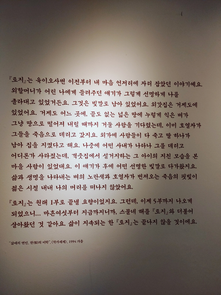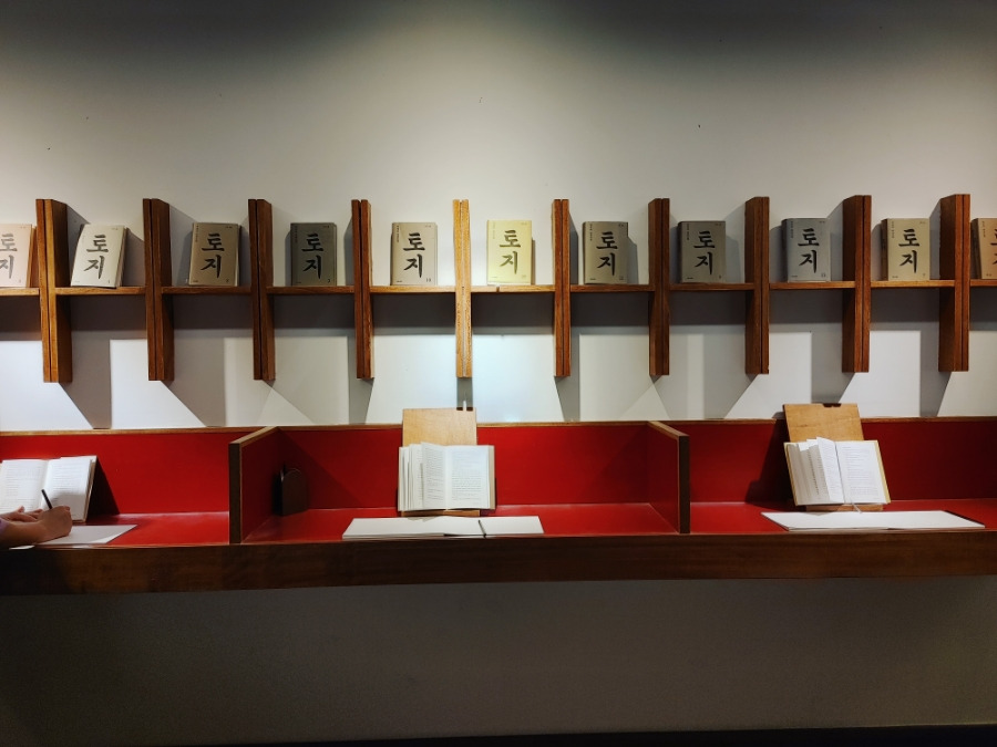 독서대에는 <토지> 소설책을 진열해놓았다. 그 밑에는 원고지가 놓여있는데 마치 내가 작가가 된 듯 책의 한 부분을 원고에 옮겨 쓸 수 있다. 먼저 쓴 사람들이 자신이 쓴 곳이 어디까지인지 날짜별로 연필 표기를 해놓았다. 뒤따라 이어쓰기를 해도 되고 내가 쓰고 싶은 문단을 옮겨 적어도 좋다. 종이에 연필로 사각사각 소리를 내며 오롯히 연필 끝에 의식을 모아 집중하는 느낌이 좋았다.