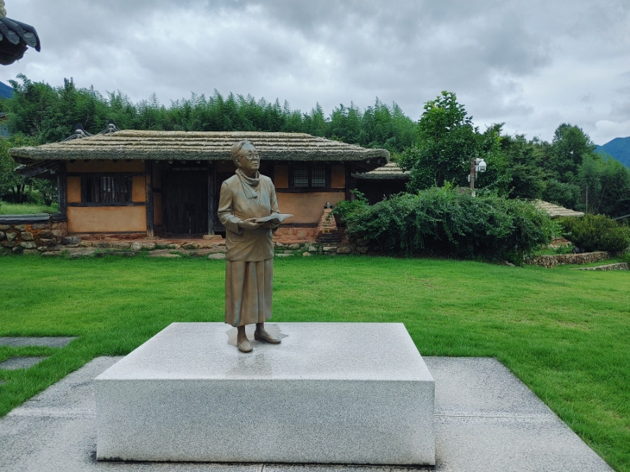 박경리 문학관 오른쪽 뜰에는 작가의 동상이 세워져있다. 사람들이 사진을 찍으며 어깨동무를 할 수 있을 만큼 낮고 조그맣게 만들었는데 관람객의 눈높이를 고려한 유족의 뜻이었다고 한다.