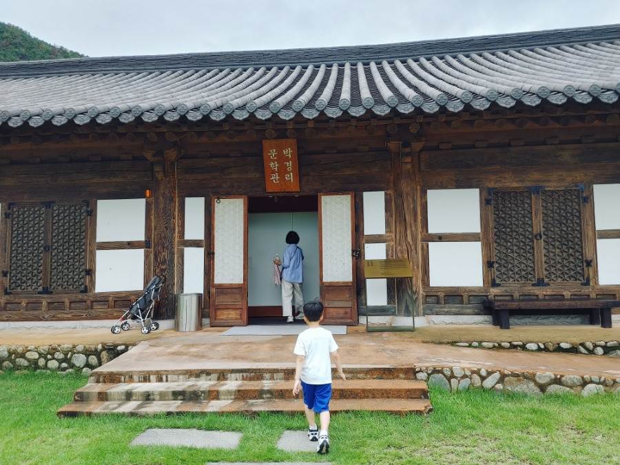 최참판댁 구경을 마치고 나니 오른편에 박경리 문학관을 가리키는 팻말이 보인다. 도서관에서 <토지>를 빌려다봐야겠다고 마음 먹었던 터에 문학관 건물을 보니 반갑기 그지없다. 카페에서 쉬며 핸드폰 게임을 하고싶어하는 아이들은 자꾸 내려가자고 졸라대는데 여기만 딱 보고가자며 통 사정을 했다.